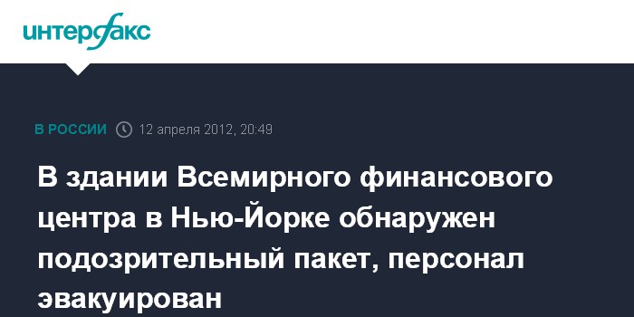 Вашингтон. 12 апреля. INTERFAX.RU - Полиция Нью-Йорка эвакуировала работников из здания Всемирного финансового центра после обнаружения в нем подозрительного пакета, сообщает агентство ЭФЭ со ссылкой на местные правоохранительные органы.