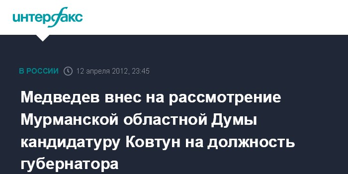 "Президент России Д.А.Медведев в соответствии со статьей 18 Федерального закона от 6 октября 1999 г. N 184-ФЗ "Об общих принципах организации законодательных (представительных) и исполнительных органов государственной власти субъектов Российской Федерации" и статьей 26.1 Федерального закона от 11 июля 2001 г. N 95-ФЗ "О политических партиях" внес на рассмотрение Мурманской областной Думы кандидатуру Ковтун Марины Васильевны для наделения ее полномочиями губернатора Мурманской области", - говорится в сообщении.