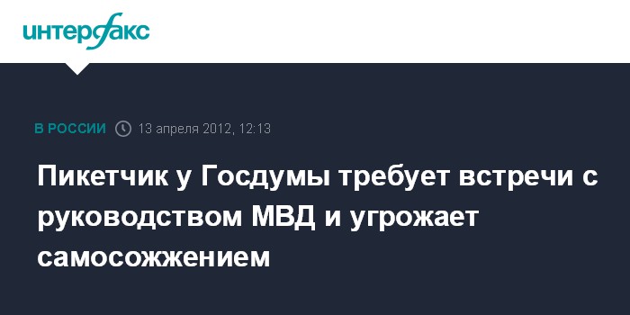 Москва. 13 апреля. INTERFAX.RU - Одиночный пикетчик возле здания Госдумы угрожает сжечь себя, если ему не дадут возможность встретиться с руководством МВД РФ.