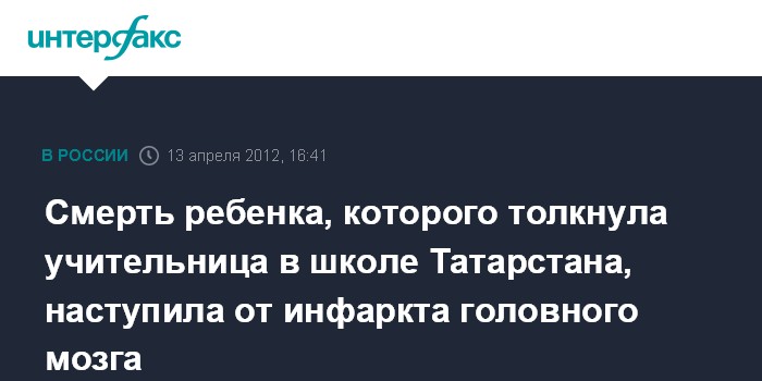 Казань. 13 апреля. INTERFAX.RU - Причиной смерти восьмилетнего ученика коррекционной школы Набережных Челнов, которого толкнула учительница, послужил тромбоз сосудов головного мозга и возникший на этом фоне инфаркт головного мозга, сообщает пресс-служба СУ СКР по Татарстану в пятницу. При этом каких-либо повреждений головы или позвоночника у мальчика судмедэксперты не обнаружили, отмечается в сообщении.
