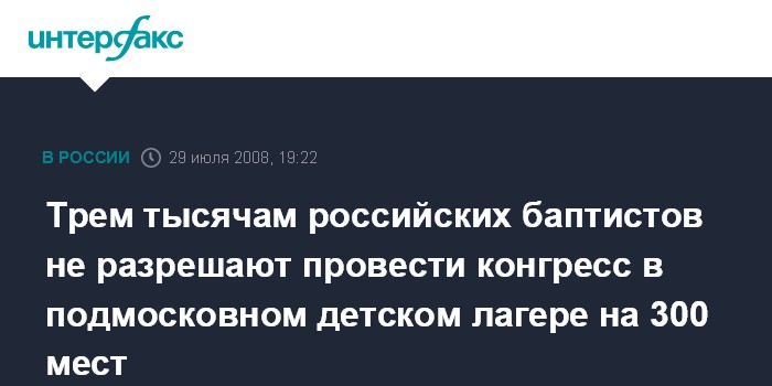 "Предварительно РСЕХБ было заявлено, что в конгрессе будут принимать участие около 3 тысяч человек. А лагерь рассчитан на 300 человек максимум. В связи с чем администрация Истринского района не разрешила проводить мероприятие на территории лагеря", - сказал собеседник агентства.