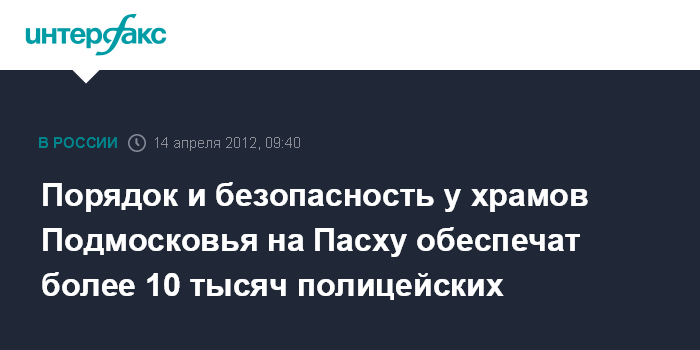 Москва. 14 апреля. INTERFAX.RU - В пасхальные выходные более 10 тысяч полицейских будут работать у подмосковных храмов, сообщили "Интерфаксу" в пресс-службе ГУ МВД России по Московской области.