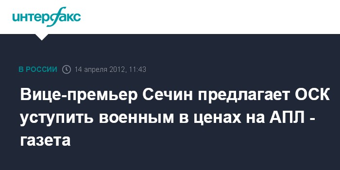"Обозначенный президентом срок для подписания контрактов истекает завтра. Для того чтобы подписание все же состоялось, правительство пошло на беспрецедентные меры: вице-премьер Игорь Сечин, курирующий в правительстве отношения Минобороны и ОСК, рекомендовал последней соглашаться на условия военных, требующих существенного снижения цены", - сообщает в субботу издание "Коммерсант".