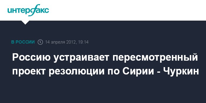 Вашингтон. 14 апреля. INTERFAX.RU - Постпред РФ при ООН Виталий Чуркин заявил, что Россию устраивает пересмотренный проект резолюции по Сирии, сообщают западные СМИ. Проект предусматривает отправку передовой группы наблюдателей в Сирию.