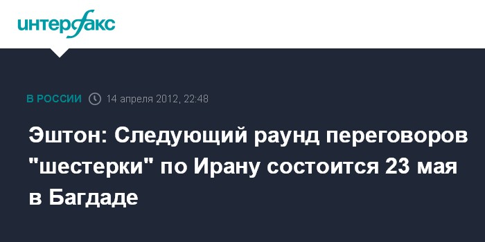 Брюссель. 14 апреля. ИНТЕРФАКС - Тегеран и страны "шестерки" договорились провести следующий раунд переговоров по иранской ядерной программе 23 мая в Багдаде, заявила верховный представитель ЕС Кэтрин Эштон.
