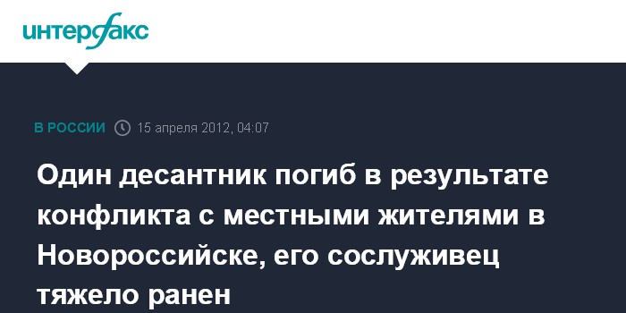 Ростов-на-Дону. 15 апреля. ИНТЕРФАКС-ЮГ - Один военнослужащий части ВДВ стал жертвой драки, возникшей на одной из улиц Новороссийска с местными жителями, а его товарищ получил тяжелые ранения, сообщили агентству "Интерфакс - Юг" в штабе новороссийского гарнизона.