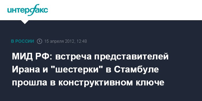 Москва. 15 апреля. INTERFAX.RU - Представители Ирана и "шестерки" посредников на встрече в субботу в Стамбуле продемонстрировали готовность к поиску взаимоприемлемых решений, сообщает в воскресенье МИД РФ. "Встреча прошла в конструктивном, уважительном ключе и продемонстрировала готовность сторон к поиску взаимоприемлемых переговорных решений", - отмечается в сообщении, размещенном в воскресенье на сайте ведомства.