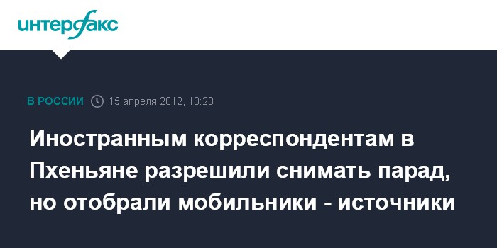 Сеул. 15 апреля. INTERFAX.RU - Иностранные корреспонденты, прибывшие в Пхеньян на освещение мероприятий по случаю 100-летия со дня рождения Ким Ир Сена, получили разрешение на съемки военного парада, сообщают СМИ из Пхеньяна. Вместе с тем по прибытию на северокорейскую границу всех иностранцев, приглашенных на праздник, вынудили сдать на хранение мобильные телефоны, которые обещали вернуть при выезде из страны.