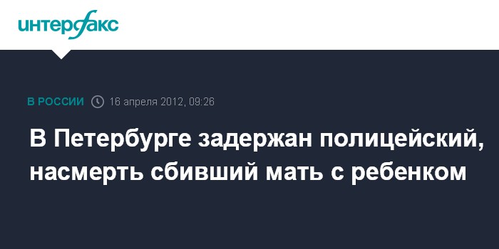 Санкт-Петербург. 16 апреля. INTERFAX.RU - Уголовное дело возбуждено в Петербурге по факту ДТП, в котором полицейский в нетрезвом состоянии на личном автомобиле сбил насмерть мать с ребенком.