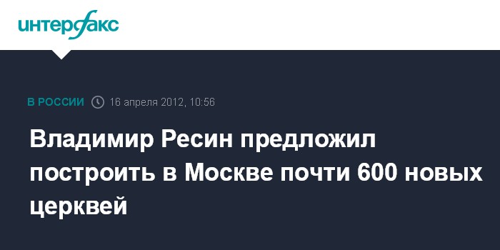 "К сожалению, 200 церквей для Москвы проблемы не решат. Для достижения среднероссийского показателя нам нужен при 316 действующих еще 591 новый храм", - заявил Ресин в интервью, которое публикует в понедельник "Российская газета" . Он отметил, что на реализацию "программы-200" потребуется "лет десять, не меньше".