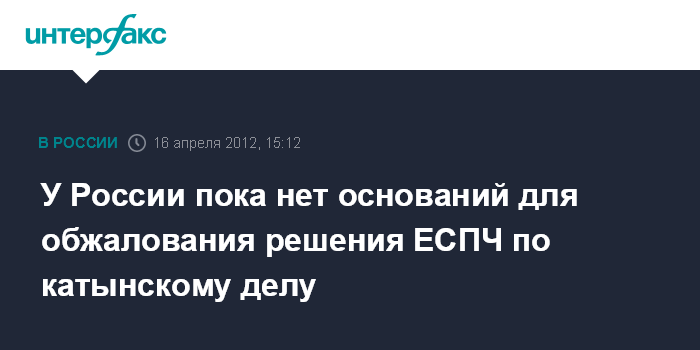 Москва. 16 апреля. INTERFAX.RU - Россия на данном этапе не планирует обжаловать решение Европейского суда по правам человека (ЕСПЧ), по "Катынскому делу", заявил "Интерфаксу" глава аппарата полпреда России при ЕСПЧ Андрей Федоров.