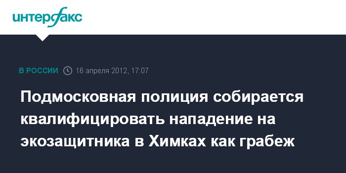 Москва. 16 апреля. INTERFAX.RU - Нападение в Химках на защитника Химкинского леса Алексея Дмитриева, совершенное утром в понедельник, будет квалифицировано как грабеж, сообщил "Интерфаксу" начальник пресс-службы ГУ МВД России по Московской области Евгений Гильдеев.