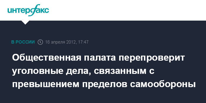 Москва. 16 апреля. INTERFAX.RU - В Общественной палате России намерены перепроверить уголовные дела в отношении лиц, осужденных за превышение пределов самообороны.