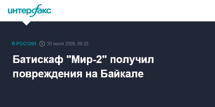 Москва. 30 июля. INTERFAX.RU - Один из батискафов, участвующих в научной экспедиции по исследованию Байкала, получил серьезные повреждения, столкнувшись с плавучей платформой.