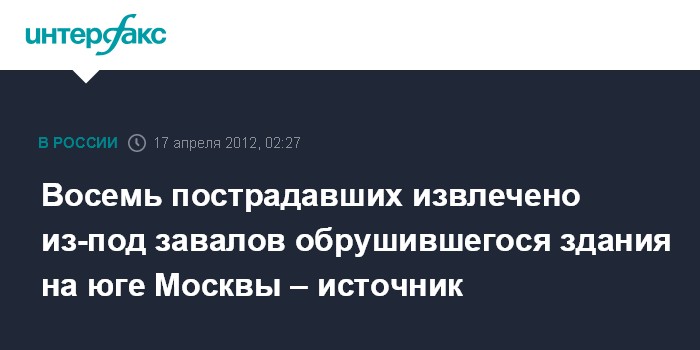 Москва. 17 апреля. ИНТЕРФАКС - Спасатели извлекли из-под завалов обрушившегося строящегося бизнес-центра на юге Москвы восьмерых пострадавших, сообщил «Интерфаксу» во вторник источник в правоохранительных органах.
