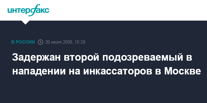Москва. 30 июля. INTERFAX.RU - Задержан второй подозреваемый в вооруженном нападении на инкассаторскую машину Сбербанка, совершенном во вторник на Ленинском проспекте Москвы, сообщил "Интерфаксу" источник в правоохранительных органах столицы.