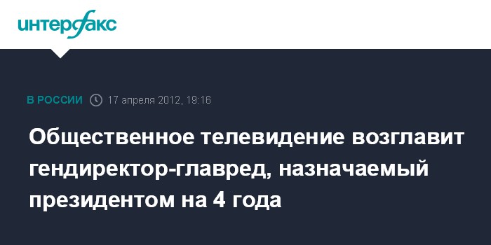 Москва. 17 апреля. INTERFAX.RU - Высшим должностным лицом автономной некоммерческой организации "Общественное телевидение России" станет генеральный директор, назначаемый президентом РФ сроком на 4 года, это же лицо станет главным редактором Общественного телевидения.