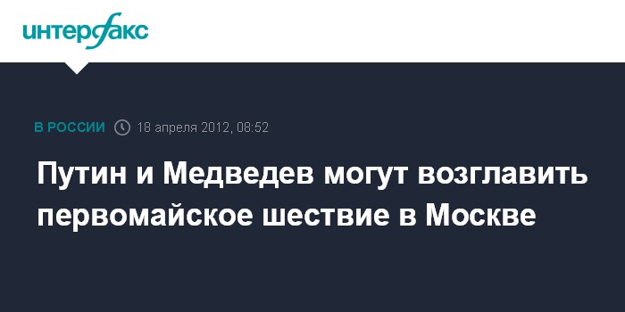 "Премьер Путин и президент Медведев могут возглавить в этом году первомайское шествие под лозунгом "Даешь справедливость!" в Москве", - сообщили изданию человек, близкий к Федерации независимых профсоюзов России (ФНПР), и единоросс.