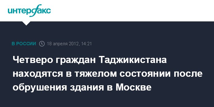 Душанбе. 18 апреля. INTERFAX.RU - Восемь граждан Таджикистана пострадали при обрушении строящегося шестиэтажного здания на юге Москвы, в том числе четверо из них находятся в тяжелом состоянии, сообщило в среду посольство республики в Российской Федерации.