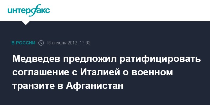 Москва. 18 апреля. INTERFAX.RU - Президент России Дмитрий Медведев внес в Госдуму на ратификацию Соглашение между правительствами РФ и Италии о транзите воздушным транспортом вооружения, боеприпасов, военной техники, военного имущества и персонала через территорию РФ в связи с участием итальянских Вооруженных Сил в международных усилиях по стабилизации и восстановлению Афганистана, сообщает в среду пресс-служба Кремля.