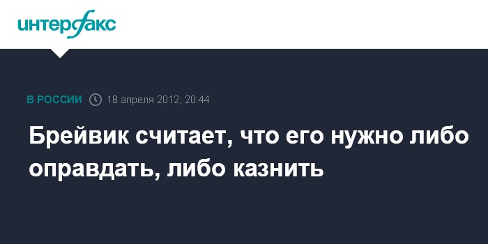 Осло. 18 апреля. INTERFAX.RU - Норвежский террорист Андерс Брейвик во время заседания суда в среду заявил, что суд может вынести только два "справедливых" решения по его делу - оправдать, либо приговорить к смерти.