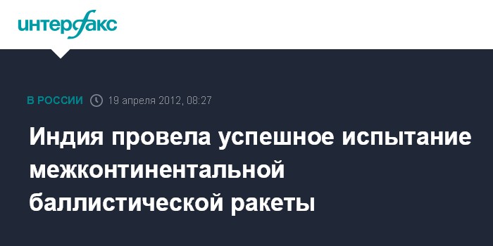 Дели. 19 апреля. INTERFAX.RU - Первое испытание межконтинентальной баллистической ракеты успешно проведено в четверг в Индии, сообщает газета Times of India.