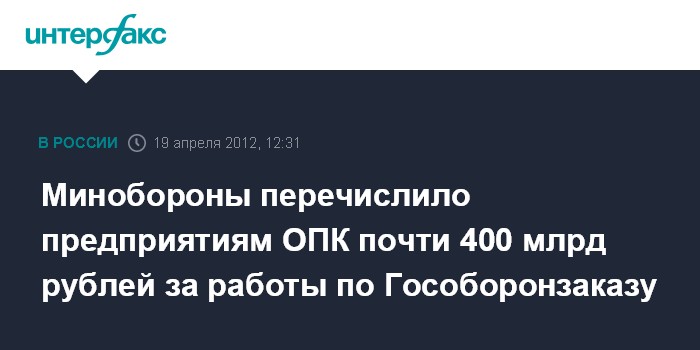 Москва. 19 апреля. INTERFAX.RU - Министерство обороны РФ заключило с предприятиями ОПК контрактов по гособоронзаказу 2012 года на 520,7 млрд рублей, сообщил первый заместитель министра обороны РФ Александр Сухоруков.
