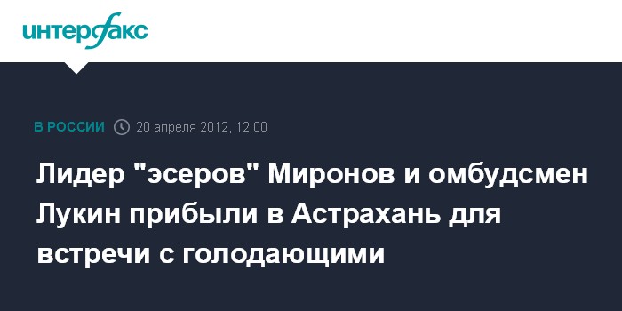 Астрахань. 20 апреля. INTERFAX.RU - Уполномоченный по правам человека в России Владимир Лукин и лидер партии "Справедливая Россия" Сергей Миронов прибыли в Астрахань, где проведут встречу с инициатором голодовки за отмену выборов мэра города "эсером" Олегом Шеиным и его соратниками.