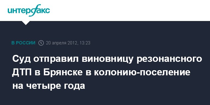 Брянск. 20 апреля. INTERFAX.RU - Ирина Добржанская, сбившая насмерть ребенка в Брянске, приговорена судом к четырем годам колонии поселения. Cуд также обязал Добржанскую выплатить потерпевшей стороне компенсацию в размере 1,5 млн рублей.