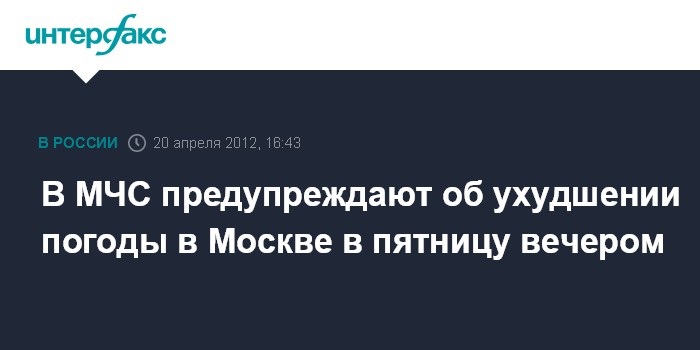 Главное управление МЧС России по Москве предупреждает о неблагоприятных погодных условиях в столичном регионе, складывающихся с 16.00 до 20.00 часов 20 апреля 2012 года. В связи с порывами ветра до 15-17 м/с, возможны повреждения линий электропередач, частичный повал деревьев, повреждение широкоформатных рекламных конструкций, приводящее к затору на дорогах, повреждения автотранспорта, обрушение слабо укрепленных конструкций.