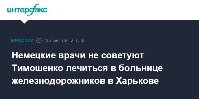 Харьков. 20 апреля. INTERFAX.RU - Немецкие врачи клиники "Шарите" не рекомендовали экс-премьеру Украины Юлии Тимошенко лечиться в ЦКБ №5 "Укрзализныци" в Харькове, заявил защитник экс-премьера Сергей Власенко.
