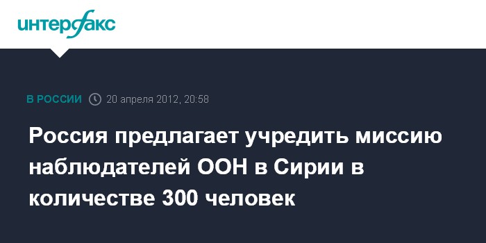 Москва. 20 апреля. INTERFAX.RU - Российский проект резолюции СБ ООН предусматривает учреждение наблюдательной миссии ООН в Сирии из 300 человек.