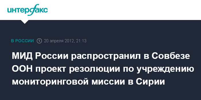 Москва. 20 апреля. INTERFAX.RU - Россия в пятницу распространила в СБ ООН проект резолюции по учреждению мониторинговой миссии ООН в Сирии, сообщает МИД РФ.
