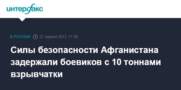 Исламабад. 21 апреля. INTERFAX.RU - Афганские силы безопасности задержали в Кабуле пять боевиков с 10 тоннами взрывчатки, сообщил в субботу представитель Национального директората безопасности Афганистана Назари.