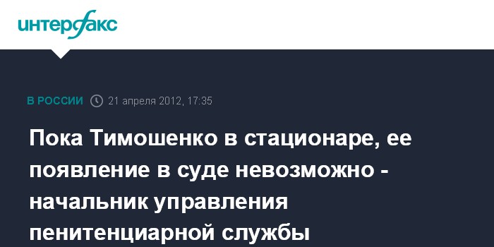 Харьков. 21 апреля. INTERFAX.RU - Экс-премьер Украины Юлия Тимошенко не появится в суде по "делу ЕЭСУ" до тех пор, пока она находится на лечении в ЦКБ N5 в Харькове, считает начальник управления пенитенциарной службы в Харьковской области Евгений Бараш.