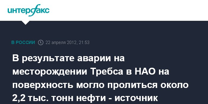 Нарьян-Мар. 22 апреля. ИНТЕРФАКС СЕВЕРО-ЗАПАД - По предварительным данным, в результате аварии на месторождении им. Требса (Ненецкий автономный округ, НАО), где в пятницу вечером произошел разлив нефти, на поверхность могло пролиться около 2,2 тыс. тонн нефти, сообщил "Интерфаксу" источник в окружной администрации.
