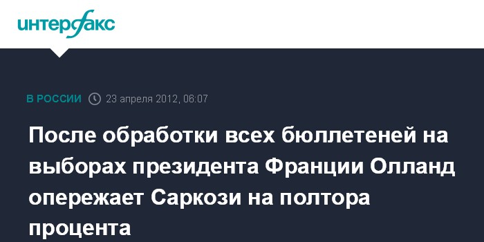 После обработки всех бюллетеней на выборах президента Франции Олланд опережает Саркози на полтора процента