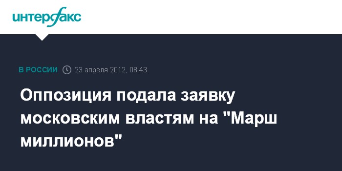 Москва. 23 апреля. INTERFAX.RU - Оппозиция подала в столичную мэрию уведомление о проведении так называемого "Марша миллионов" 6 мая по Тверской улице, сообщил координатор "Левого фронта" Сергей Удальцов. Шествие, как ожидается, пройдет от Триумфальной до Манежной площади и закончится митингом на ней.