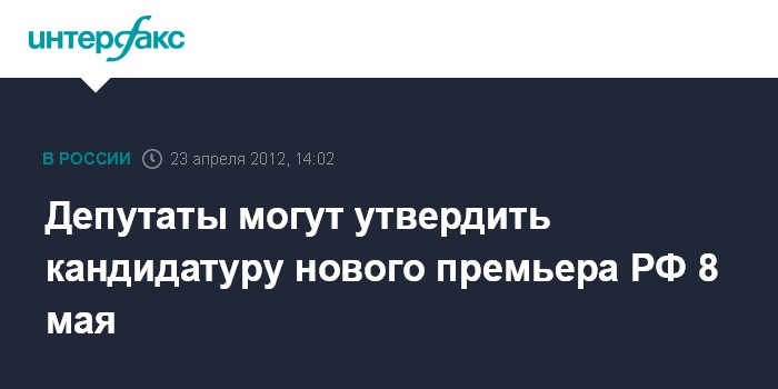 Москва. 23 апреля. INTERFAX.RU - Кандидатура нового премьер-министра, как ожидается, будет рассмотрена и утверждена Госдумой 8 мая, заявил спикер палаты Сергей Нарышкин.