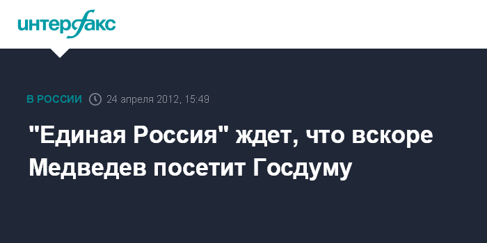 Москва. 24 апреля. INTERFAX.RU - "Единая Россия" рассчитывает, что в ближайшее время Дмитрий Медведев, чью кандидатуру Владимир Путин предложил на пост председателя партии, посетит Госдуму.