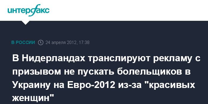 Брюссель. 24 апреля. INTERFAX.RU - В Нидерландах на центральных телеканалах появилась реклама под названием "Удержи его дома" с призывом к женщинам уговорить мужчин не ехать в Украину на Евро-2012 из-за того, что "эта страна полна красивых женщин".