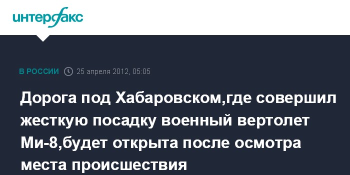 Хабаровск. 25 апреля. ИНТЕРФАКС-ДАЛЬНИЙ ВОСТОК - Дорога Гаровка-Лесное под Хабаровском, на которую совершил жесткую посадку военный вертолет Ми-8 МТ, в настоящее время перекрыта для движения автомобильного транспорта, следователи осматривают место происшествия, сообщил в среду агентству "Интерфакс-Дальний Восток" источник близкий к расследованию авиационного происшествия.