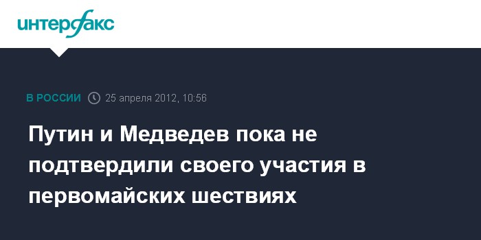 Москва. 25 апреля. INTERFAX.RU - Президент РФ Дмитрий Медведев и премьер Владимир Путин пока не прислали подтверждения своего участия в первомайских акциях профсоюзов в центре Москвы, заявил на пресс-конференции в центральном офисе "Интерфакса" глава Московской федерации профсоюзов Михаил Нагайцев.