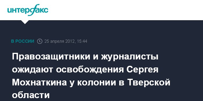 Тверь. 25 апреля. INTERFAX.RU - Сергей Мохнаткин будет освобожден, как только в исправительную колонию 4 города Торжка поступят соответствующие документы - предписание из информационного центра управления МВД по Тверской области, сообщили "Интерфаксу" в пресс-службе регионального УФСИН в среду.