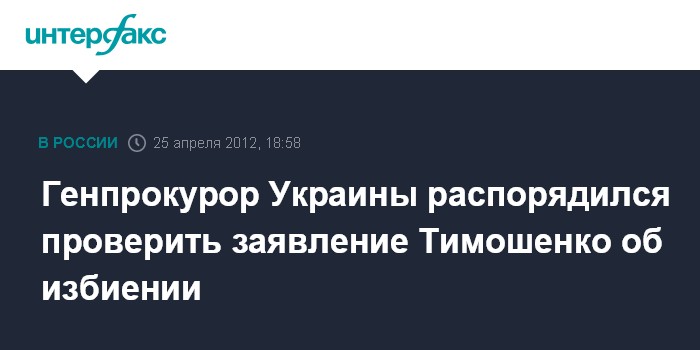 Киев. 25 апреля. INTERFAX.RU - Генеральный прокурор Украины Виктор Пшонка поручил проверить заявление экс-премьера Юлии Тимошенко о причинении ей телесных повреждений сотрудниками Качановской исправительной колонии.