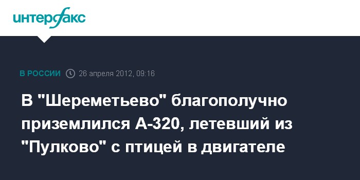 Инцидент произошел в 23:18 мск среды. После взлета из аэропорта "Пулково" (Санкт-Петербург) экипаж самолета Airbus А-320 доложил о попадании птицы в двигатель. Командир воздушного судна принял решение продолжить полет и благополучно посадил лайнер в "Шереметьево" в 00:13 мск.