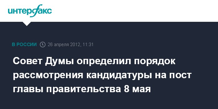 Москва. 26 апреля. INTERFAX.RU - Совет Думы определил порядок рассмотрения кандидатуры на пост главы правительства на пленарном заседании 8 мая, сообщил первый вице-спикер Госдумы Александр Жуков журналистам в четверг.