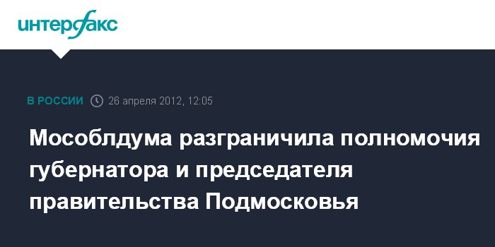 Москва. 26 апреля. INTERFAX.RU - Депутаты Мособлдумы во втором чтении приняли поправки к уставу Московской области, разделяющие полномочия губернатора и председателя правительства региона.