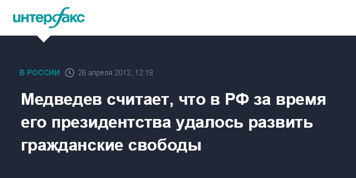 Москва. 26 апреля. INTERFAX.RU - Президент РФ Дмитрий Медведев считает, что за годы его президентства Россия серьезно продвинулась по пути развития гражданских свобод.