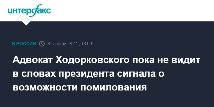 Москва. 26 апреля. INTERFAX.RU - Защита бывшего руководителя НК "ЮКОС" Михаила Ходорковского не увидела в словах президента РФ Дмитрия Медведева о помиловании конкретного позитивного сигнала для своего подзащитного.